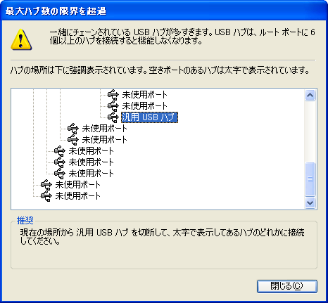 『最大ハブ数の限界を超過』というエラーダイアログを表示し、その内容には『一緒にチェーンされている USB ハブが多すぎます。USB ハブは、ルート ポートに6個以上のハブを接続すると機能しなくなります。』。日本語に難有りなのを抜かせばエラー内容が分かりやすいメッセージとなっています。