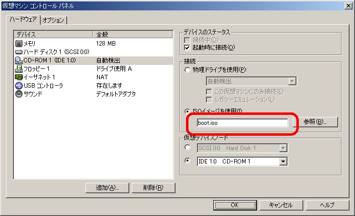 boot.iso を hdd image のあるディレクトリ下に置き、『VM(M)』→『設定(S)...』を選択します。『CD-ROM1 (IDE 1:0)』の『接続』の設定を『ISOイメージを使用(I):』に変更し、イメージファイルを boot.iso と設定します。
