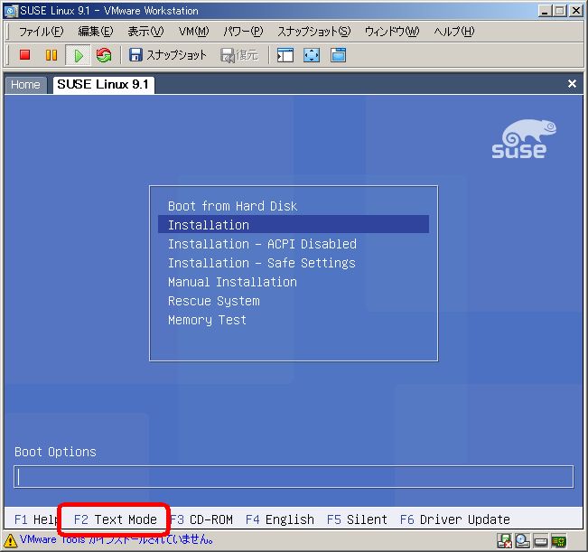 この時に [F2] キーを押して『800x600』→『Text Mode』にしてください。この設定を行わないと後々 YaST が化けまくります。この現象は SUSE Linux 9.0 でも再現するらしく、VMware の Guest OS Install Guide にも Text Mode による install が記載されていました。
