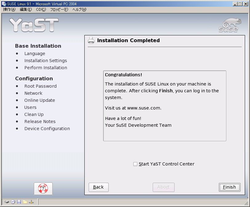 SUSE Linux 9.1 Personal の ISO image 版で Install を行ってみました。