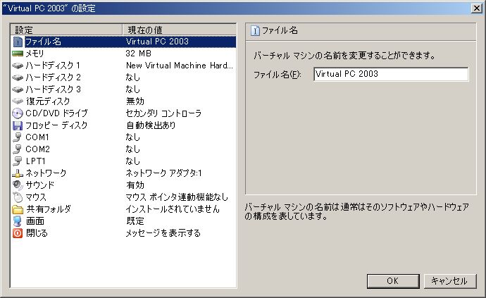 - Virtual PC 2004 for Windows 日本語版の設定画面